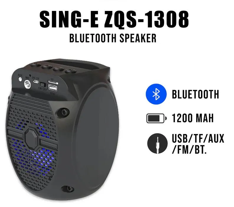 استمتع بصوت قوي وإضاءة جذابة مع سماعة Sing-E ZQS 1308 اللاسلكية. تصميم محمول يدعم تشغيل الستريو، مثالية للحفلات والرحلات والأماكن المفتوحة. أداء صوتي مميز مع مؤثرات ضوئية تخلق أجواء مبهجة في كل مكان.